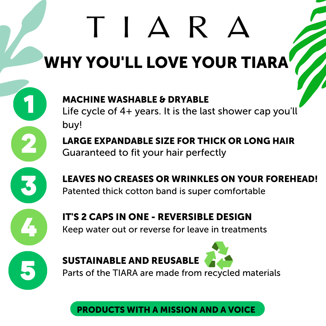 TIARA is a fair-trade product made from recycled materials. It’s the regular use of products like this one that will ultimately save our planet. You’re not only investing in beautiful hair when you purchase a TIARA shower cap, you’re investing in a healthier, more beautiful planet, too. Now that’s a royal win!